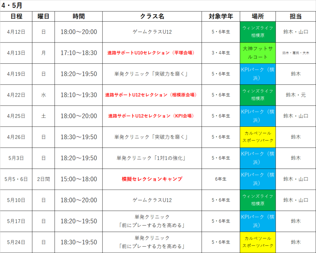 相模原会場U12(4月22日)・横浜会場U12(4月25日)・平塚会場U10(4月13日)にセレクションを実施します。※セレクション日程が合わない方は個別に対応可能ですのでお問い合わせください(sportsbito@gmail.com)