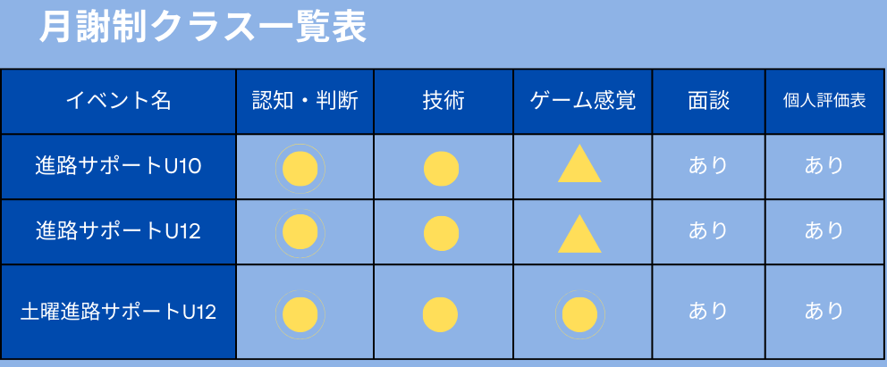 チームではポジションや役割が決められていて個人を発揮できない選手や 失敗が怖くてチャレンジできないといった選手におすすめのクラスです。ジュニアユースやトレセンのセレクションに向けて個人の特徴を伸ばす場としてご活用ください。アカデミー生だけでなく、どなたでもご参加頂けます。認知・判断で悩んでいる選手は進路サポート+ゲームクラス(日曜)の 組み合わせがおススメです。